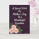 This card features a tall, centered message in flowing lettering that fills most of the vertical space, set against a deep purple background. The main text is bright white and reads “Special Wish On Mother’s Day To a Wonderful Grandma,” standing out clearly as if gently glowing. Behind the words, faint swirling, plant-like patterns drift across the purple field, adding softness without distracting from the message. In the lower left area, three blush-pink roses open their petals as if leaning toward one another in a tender, affectionate cluster ❤️. Their leaves are a fresh green, giving a natural contrast that makes the flowers feel lively and cared for. Small white starburst marks are sprinkled around the flowers like tiny sparks of celebration 🌼. A subtle shadow under the white lettering gives the words a slightly raised look, while the roses sit neatly in the bottom-left corner against the dark purple backdrop.