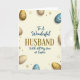 This card features a creamy background with a centered Easter message that reads, “To A Wonderful HUSBAND With All My Love at Easter,” arranged in stacked lines. The words “To A Wonderful” sit above in smaller, flowing lettering, while “HUSBAND” stands out in large golden-brown serif letters, like a steady anchor in the middle. Below it, “With All My Love at Easter” appears in a smaller matching tone, giving the layout a gentle, affectionate rhythm. Around the text, several decorated egg shapes in warm gold and deep teal create a cozy frame, their soft shading making them look slightly raised. The eggs are filled with fine swirls, thin lines, and leaf-like details that feel like quiet, thoughtful touches shared between close partners 🐰. Tiny gold starbursts and little stars are scattered lightly between the eggs, adding a soft twinkle 🌷. The teal and gold eggs sit at varying angles along the sides, with the smallest stars tucked into the open spaces near the lettering.