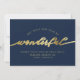 Modern, elegant script calligraphy based business holiday card reads We are so very grateful alongside your custom text and message. On the back is space for another message and your corporate logo. This is the elegant blue and printed gold version.