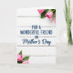 On the front of the card the message “FOR A WONDERFUL FRIEND ON Mother’s Day” sits centered in deep navy blue over a white, wood-plank background. The first line is set in simple, sturdy lettering, while “Mother’s Day” appears in a flowing cursive style that softens the look and adds a gentle, affectionate tone ❤️. The pale planks run horizontally, giving a light, airy texture that makes the dark text stand out clearly. Soft lighting keeps the scene calm and inviting, like a quiet moment shared between close friends. In the upper right corner, a small cluster of pink rosebuds and green leaves leans inward as if reaching toward the words. A matching floral cluster anchors the lower left corner, creating a balanced frame that feels tender and thoughtful 🌼. The rosebuds show delicate blush petals with fresh green foliage against the bright white boards.