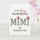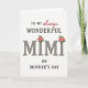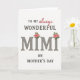 This greeting card features a simple white background with a neat, centered layout that feels calm and affectionate ❤️. Near the top, “TO MY” and “WONDERFUL” appear in dark charcoal, set in sturdy, easy-to-read lettering that sets a steady tone. Just beneath, the word “always” is written in crimson with a flowing look, like a soft note slipped into the design for someone close. The name “MIMI” sits in the middle in very large dark charcoal letters with a slight shaded depth, giving it a gentle, standout presence. Small clusters of pink blossoms and green leaves decorate the first letter, adding a sweet, caring touch 🌼. At the bottom, “ON MOTHER’S DAY” is placed in matching dark charcoal text, balancing the top lines and framing the message. The floral accents appear as light pink petals with fresh green sprigs tucked along the upper left of the first letter.
