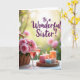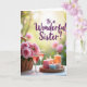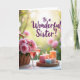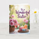 This greeting card shows a softly blurred garden background washed in golden light, like early morning or late afternoon. In the foreground, a wicker basket sits on a light surface, filled with delicate pink roses whose open petals lean toward each other like close friends ❤️. Beside the flowers, two tall wine glasses hold a rosy drink that catches the light and adds a gentle sparkle. A round woven tray nearby holds five pillar candles in soft pink, creamy ivory, calm blue, and warm peach, each with a small steady flame. The mix of woven textures, smooth glass, and velvety petals creates a cozy, intimate scene that feels like a shared toast 🌼. Across the upper area, the text “To a Wonderful Sister!” is placed prominently in flowing purple lettering, standing out against the hazy garden. The candles sit clustered on the tray with their pastel sides glowing softly while the roses spill slightly over the basket’s rim.