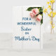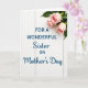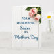 This card features a calm, airy layout on a white wooden background with faint vertical grain that adds gentle texture. Centered on the front is the message “FOR A WONDERFUL Sister ON Mother’s Day,” set in deep blue lettering that draws the eye right away. The words “FOR A WONDERFUL” and “ON” use a neat, simple type style, while “Sister” and “Mother’s Day” appear in a flowing cursive style that feels like a soft hug between close family members ❤️. In the upper right corner, three small pink blossoms lean toward the text as if sharing a quiet, affectionate moment. Their petals are lightly curled and partly open, paired with fresh green leaves that frame the corner without crowding it 🌼. The lighting is even and gentle, bringing out the smooth paint-like finish of the letters and the delicate edges of the flowers. A trio of pale pink blooms with bright green foliage sits at the top right against the white, lightly grained wood surface.