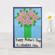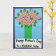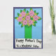This card features a stylized bouquet arranged in a bright green vase, set against a calm sky-blue background that keeps the focus on the flowers. Several large round blossoms in soft pink sit near the top, each with a spiral center and dark outlines that make them stand out. Between them are smaller yellow star-shaped flowers and layered green leaves, creating a cozy, cared-for look, like a gift chosen with a sister in mind ❤️. The bouquet fills most of the upper area, while a wide white banner stretches across the lower portion to ground the design. Centered on that banner, the text reads “Happy Mother’s Day To a Wonderful Sister” in rounded black lettering that feels friendly and easy to read. The strong outlines and simple shapes give the scene a sweet, affectionate tone, like a warm hug shared between close family 🌼. The banner sits at the bottom edge beneath the vase, with the message running across it in black.