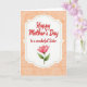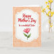 This card features a white, rounded panel centered on a soft peach background with a faint fabric-like texture. A tiny dotted border traces the edge of the panel, giving it a gentle, cozy frame. Near the top of the panel, red lettering reads “Happy Mother’s Day,” with a smaller red line beneath it that says “to a wonderful Sister,” stacked neatly and easy to spot. The bright red text feels like an affectionate note passed between close family, with a tender, sisterly warmth ❤️. Beneath the words, a watercolor-style flower in blushing pink opens its petals in soft gradients from deeper rose toward a pale blush. Two muted green leaves sit at the base of the bloom, adding a calm, natural balance 🌼. The overall layout keeps the message above and the blossom below, with plenty of airy space around the dotted border and pale peach backdrop.