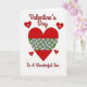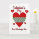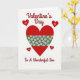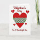 This Valentine's Day card features a large red heart centered on a white background, making it the first thing you notice ❤️. Across the middle of the heart is a green band filled with small white daisy-like flowers, each with a tiny blue center. Four smaller red hearts sit near the corners, and each one has a soft pink shape inside that adds a gentle, caring feel. The layout is simple and balanced, with bright reds and fresh green standing out clearly against the white space. At the top, the text “Valentine’s Day” appears in a flowing cursive-style letter look in dark ink, placed neatly above the main heart. At the bottom, “To A Wonderful Son” is written in the same cursive-style lettering, centered under the heart, so the message feels direct and loving 🥰. It’s a meaningful card to give because the hearts and flowers feel like a warm hug, and the wording makes your affection clear without needing a long note.