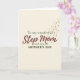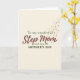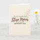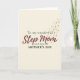 This Mother's Day card features the words “Step Mom” centered in large, flowing dark red lettering with a soft watercolor look, drawing the eye like a warm embrace ❤️. Above it, “To my wonderful” sits smaller in dark green near the top, and below, “with love on MOTHER’S DAY” appears in matching dark green, neatly framing the main message. The background is a creamy off-white that keeps everything calm and airy, letting the lettering feel intimate and close, like a quiet note between two people. Earthy greens and deep crimson are softened by dusty rose touches, giving the layout a gentle, affectionate tone without crowding the space. From the upper right corner, tiny pink flowers begin to drift inward, as if carried on a light breeze, adding a sweet, caring energy 🌼. Scattered among the blossoms are small golden specks that catch the light and make the corner feel lightly celebratory. The floral trail curves downward toward the center, subtly wrapping around the words without covering them. The upper-right cascade includes petite pink petals and fine gold dots that arc toward the middle of the card.