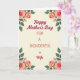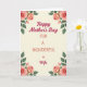 This greeting card features a creamy, soft background that sets a gentle stage for a Mother’s Day message. Centered text reads “Happy Mother’s Day” in flowing deep crimson lettering, drawing the eye with a romantic, affectionate tone ❤️. Just below, “FOR A WONDERFUL” appears in a simple, clear style, also in deep crimson, creating a neat contrast in the middle of the layout. The word “Wife” follows in the same flowing deep crimson lettering, and a small crimson heart sits just above it like a sweet finishing touch. In each corner, watercolor-style florals frame the message, with full roses and small buds in blush pink and soft peach that feel like a tender bouquet offered with care 🌼. Layered petals add soft texture, while emerald-green leaves curl around the blossoms and guide your gaze back toward the center. The overall arrangement feels balanced and close, like a quiet embrace formed by flowers around the words. The four floral clusters sit symmetrically in the corners, with the deep crimson text centered and the tiny heart hovering above “Wife.”