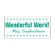 This fun rubber stamp design features the motivational feedback message "Wonderful Work!" and a custom educator's name. It also features a decorative star outline shape. It could be used by a school teacher, educator, or tutor when marking assignments, to acknowledge that the student has done well.