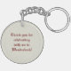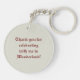 Round double-sided acrylic keychain with an image of a beige and burgundy Alice in Wonderland design in the shape of a rabbit. The back is beige and has customizable text that reads “Thank you for celebrating with me in Wonderland!" See the entire Wonderland Keychain collection in the PARTY FAVORS section.