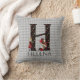 Whimsical Wonderland themed throw pillow features vintage Alice and the Queen of Hearts character color illustrations with large letter / initial H with a black/gold/red card suites fill pattern on a vintage gray harlequin background. Personalize further with customizable name text