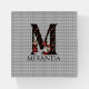 Whimsical Wonderland themed paperweight features vintage Alice and the Queen of Hearts character color illustrations with large letter / initial M with a black/gold/red card suites fill pattern on a vintage gray harlequin background. Personalize further with customizable name text