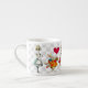 White espresso cup with vintage images of all things Wonderland on a gray and white checkerboard background. There’s a backwards clock, a “Drink Me” bottle, a brass skeleton key, Alice when she was 10 feet tall, the White Rabbit, a disappearing Cheshire Cat, and more. See matching candy jar, pitcher and teapot. See the entire Wonderland Mug collection in the FOOD/BEV | Dishes section.