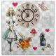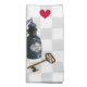 Set of 4 20” x 20” cloth dinner napkins with vintage images of all things Wonderland on a gray and white checkerboard background. There’s a backwards clock, a “Drink Me” bottle, a brass skeleton key, Alice when she was 10 feet tall, the White Rabbit, a disappearing Cheshire Cat, and more.