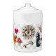 Medium white Porcelain teapot with vintage images of all things Wonderland. There’s a backwards clock, a “Drink Me” bottle, a brass skeleton key, Alice when she was 10 feet tall, the White Rabbit, a disappearing Cheshire Cat and more. See matching candy jar, espresso cup and pitcher. See the entire Wonderland Teapot collection in the FOOD/BEV | Dishes section.