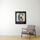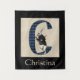 Whimsical design for Alice in Wonderland lovers of all ages features capital letter / initial C with black and blue harlequin fill and original White Rabbit illustration that has been tinted, on a faux wood panel and black background. Personalize with name or other message