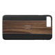 Handsome iPhone 7 Plus case, with graphics of a brown wood grain look, running down the middle of the case. A black metallic look, on both sides of the case, has a silver tone band as a border. Personalize the one letter monogram, in the center of the case, to suit your needs. Great gift idea for him.