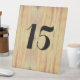Rustic wood wedding and event table number signs. Pedestal signs come in various sizes and have black numbers over a light tan wood grain design. Change the numbers, one at a time, and add to cart. Click the item in the cart to get back to the page and change the number. Do this for each number needed. Set on reception tables to direct guests to be seated.
