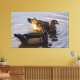 This stretched canvas features a pair of Wood Ducks, also known as Carolina ducks, swimming quietly together on a lake in the late afternoon sun. Wood duck typically pair up in the winter and begin breeding in early spring. During breeding season, the male drake has distinctive stripes that set off his green head.