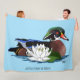 A wood duck in the water with a white water lily beside the duck in a backdrop of blue