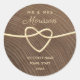 Simple, elegant, modern script wood return address sticker for weddings, with gold rope heart.