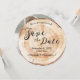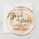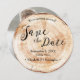 For your rustic wedding theme, discover the perfect Save the Date card featuring charming printed wood grain elements. This round card design mimics the rustic beauty of a wood disc slice often found at romantic weddings. Personalize it with the names of the bride and groom, wedding date, and location. You can also include your wedding website and a photo to make it truly unique. If a wedding website isn't applicable, feel free to exclude it. Create a memorable impression with this exquisite rustic Save the Date card."