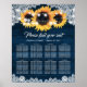 Complement your rustic navy blue wedding party with this elegant seating chart for 8 tables featuring sunflower flowers on a rustic wood background adorned with delicate floral lace and string lights. Matching items available.