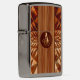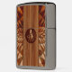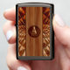 An exquisite design featuring a smooth central wood band framed by a carved triangular-rounded motif in contrasting wood tones. At its heart, your monogram appears within a circular frame, intricately intertwined as though engraved into the wood. A sophisticated accessory, this lighter adds a touch of timeless elegance to your style.