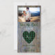 Rustic wood wedding monogrammed photo Save the Date announcements- Personalized couple photo at top. Rustic, green buffalo plaid heart has monogrammed initials of the bride and groom. Reads Save the Date below photo in elegant green script with shadow effect and wedding date. Personalized bride and groom names at bottom with drop shadow, in matching green lettering. With rustic wood photo background of scarred, distressed woodgrain. Fits rustic weddings, barn weddings, boho wedding themes, and woodland forest weddings. Perfect for rustic bridal shower or country western wedding anniversary party as well.