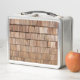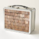 A cool, stainless steel lunchbox with a photograph of wood shingles.