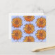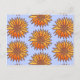A woodcut-style illustration of cheery orange sunflowers on a blue background, inspired by a visit to Kansas.