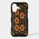 A medieval-looking woodcut pattern with four stylized flowers in a gold filigree frame, on a black background. Stylish, classy, elegant, this iPhone case resembles an antique book cover.