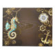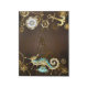 Brown wooden background with sea, mechanical ridge, an antique steering wheel, golden anchor and various gold and brass gears. Steampunk style.
