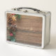 wooden background with pine cones metal lunch box