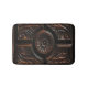 This stunning bath mat is decorated with an image which is so realistic, it looks almost three dimensional. It is a beautiful artistic, rustic wood carving in shades of brown, gold, mahogany and black. A central abstract circular flower image has petals radiating out to a carved circle which is surrounded by four sections. Each section has abstract leaf carvings.
