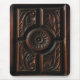 This mousepad is decorated with an image of a beautiful artistic wood carving in shades of brown, gold, mahogany and black. A central abstract circular flower image has petals radiating out to a carved circle which is surrounded by four sections. Each section has abstract leaf carvings.
