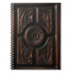 This notebook is decorated with an image of a beautiful artistic wood carving in shades of brown, gold, mahogany and black. A central abstract circular flower image has petals radiating out to a carved circle which is surrounded by four sections. Each section has abstract leaf carvings.