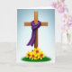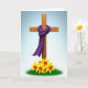 This design shows a tall wooden cross with visible grain and gentle shading, set against a calm sky that fades from soft blue at the top to bright white near the bottom. A deep purple cloth is draped over the crossbar, its folds flowing like a shared shawl and its tiny, snowflake-like pattern adding a tender, intimate touch. Near the base, a cluster of golden-yellow spring flowers with orange trumpet centers rises from thick green grass, bringing in a fresh 🌷 note. The lighting stays even and calm, keeping the wood, fabric, and petals softly defined without harsh shadows. A short Easter greeting sits near the top in a simple, dark font, while a smaller line of text rests near the bottom in a matching tone. The contrast between the solemn purple and the sunny flowers feels like a quiet promise between close friends, gentle and steady. The purple cloth hangs in two long tails, one curling slightly over the front edge of the cross and the other trailing down beside the flowers 🐇.