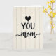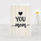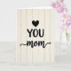 This greeting card features a simple black heart centered near the top, setting a tender, affectionate tone ❤️. Just below it, the word “YOU” appears in large uppercase letters in black, placed squarely in the middle for strong emphasis. Under “YOU,” the word “mom” is written in a flowing cursive-style look, also in black, adding a softer, more intimate contrast. The mix of firm lettering and gentle curves reads like a close, caring note meant for someone cherished. Behind the message is a pale cream background made of vertical wooden planks, giving the scene a cozy, home-like feel 🌼. Light wood grain lines and faint shadows run up and down the boards, adding texture without distracting from the message. The black heart and text stand out sharply against the light surface, with the heart sitting above “YOU” and “mom” aligned beneath it on the same central axis. The background shows softly weathered plank edges with subtle gaps between each vertical board.