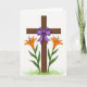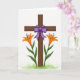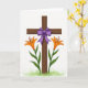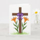 Designed with a sturdy wooden upright shape at the center, shown in warm brown with a light grain that gives it an aged, steady look. Where the horizontal and vertical pieces meet, a deep purple bow is tied neatly, its shaded folds adding a gentle touch that feels like a caring gesture between close friends. On both sides, two trumpet-shaped flowers rise on slim green stems, leaning inward as if drawn toward the bow 🐰. Their petals glow in bright orange, and each bloom shows clear stamens with reddish-brown tips for added detail. The layout stays evenly balanced left to right, guiding your eyes upward to the tied bow and the meeting point. Near the bottom, a soft green wash suggests new grass or earth, keeping the scene grounded without crowding it 🌷. The main greeting text sits above the central shape in purple, with a smaller line beneath it in green. The background remains plain white, making the brown wood, orange flowers, and violet bow stand out sharply.