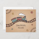 A birthday postcard featuring an illustration of a smiling wooden train chugging along a winding track. The card background is a warm, gradient textured beige with subtle details like wooden gears and hand-drawn stars. A nice illustration to send for a child's birthday or a wooden toy lover's birthday.