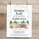 Budget-friendly rustic baby shower invitation featuring a cute illustration of woodland animals with their tent camping in the mountains and forest, an overlay of gold stars and "Adventure Awaits" and the mother-to-be's name in a dark hunter green script. Easily personalize the shower details.