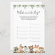 Woodland animals themed baby shower guess what's in the bag game card features a watercolor woodland animals illustration and watercolor greenery eucalyptus garland and elegant handwritten style font.