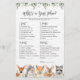 Woodland animals themed baby shower what's in your phone game card features a watercolor woodland animals illustration and watercolor greenery eucalyptus garland and elegant handwritten style font.