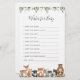 Woodland animals themed baby shower wishes for baby game card features a watercolor woodland animals illustration and watercolor greenery eucalyptus garland and elegant handwritten style font.