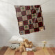 A baby blanket featuring a buffalo plaid and burlap patchwork inspired design with illustrations of woodland animals including a fox, skunk, chipmunk, owl, deer, and raccoon. Personalize the name under maple leaf.