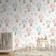Take flight with this captivating Woodland Animals Hot Air Balloon wallpaper. Adorable forest creatures, including a fox, bear, deer, owl, and squirrel, soar through a dreamy sky in beautifully rendered pastel hot air balloons. The soft, gentle colors—blush pink, pale mint, and butter yellow—perfectly complement the white background, which is sprinkled with delicate clouds, tiny golden stars, and sweet wildflowers. This whimsical, gender-neutral design brings a sense of adventure and magic to any space, making it a perfect feature wall or full room covering for a baby nursery, child's bedroom, or play area. Search ID1230 to see products with this enchanting pattern. Note: design adapted from generative content.
