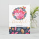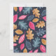 This delightful holiday card features a sleeping pink fox inside of a woodland leaf and acorn wreath, with a small bird near by - with a lovely delicate scroll font detail in gold color with the word "joyful" - and a blue, pink, green and gold leaf pattern to the front and back