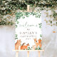 This welcome sign features a soft woodland animal design and modern fonts. The script heading is an image that cannot be edited. All of the other text is fully editable. For more advanced customization of this design, simply select the "Customize It" button above.