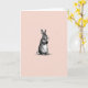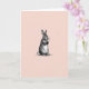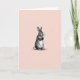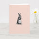 This design shows a single upright woodland rabbit 🐇 centered on the card, drawn in a classic engraved look with fine cross-hatching that makes the fur seem soft and touchable. Its long ears rise high and its round eyes look slightly to the side, as if noticing a friend nearby with quiet curiosity. The front paws are held close together, giving the pose a gentle, affectionate shyness that reads like a small, tender hello. Behind the rabbit, the background is a blush-pink field with faint diagonal lines that add texture without pulling attention away from the figure. The rabbit itself stays in a mostly black-and-white palette, letting the warm pink backdrop and the dark ink lines create a calm contrast. Any text would sit neatly above the rabbit in a small, dark gray tone, leaving plenty of open space around the ears, with a shorter line centered below in the same color near a tiny 🌷. The soft pink wash continues to the edges while the fine diagonal striations remain visible across the entire background.